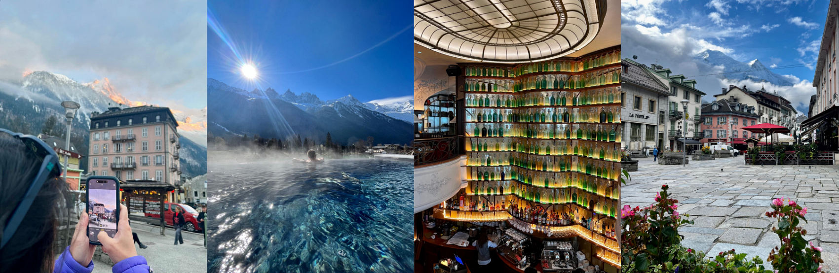 For something a little different, QC Terme Chamonix offers one of the most magical spa views in the Alps. As the sun sets, steam rises from the outdoor pools, turning the scene into a dream of warm water, mountain silhouettes and soft golden light. It’s a place to slow down, not stage — so enjoy the moment first, and keep phones safely away from the pools when you finally take that perfect shot.