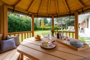 The chalet features high-end finishes and great amenities including an outdoor hot tub, private sauna, cosy fireplace, TV room, and a private garden with a BBQ. It’s the perfect place to unwind after a day in the mountains.